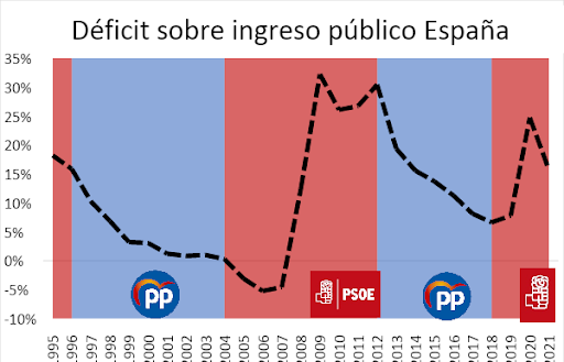 Una vez más vemos la misma tónica que en el caso del déficit: el stock de deuda pública, a grandes rasgos, crece con el PSOE y disminuye con el PP. Esto tiene todo el sentido del mundo si ya hemos analizado los gráficos de déficit en los artículos anteriores. Sin embargo, hay un par de cuestiones interesantes que podemos añadir en el análisis de la deuda pública. A tal efecto, volvemos a incluir el gráfico de déficit sobre ingreso público.