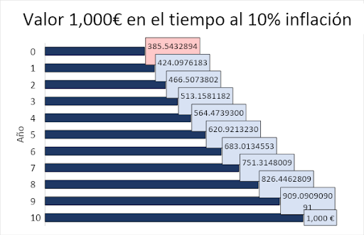 En el gráfico 3 se puede observar qué ocurre con el valor real de 1.000€ en el tiempo al 10% de inflación anual. Un deudor que tenga que pagar 1.000€ después de 10 años de inflación al 10%, en recursos reales equivalentes estaría pagando sólo 385.5€. Esta es quizá una de las razones por las que el Banco Central Europeo realmente no tiene demasiado incentivo a luchar contra la inflación. La inflación alta es un problema enorme para las economías y para las personas más responsables financieramente (que son las personas que ahorran), pero da balones de oxígeno a los agentes económicos más irresponsables y endeudados. Y es difícil imaginar a alguien más irresponsable y endeudado que un Estado contemporáneo.