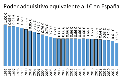 En el gráfico 4 se puede ver la depreciación del poder adquisitivo del equivalente a un euro desde 1995 hasta 2022. En términos reales, el equivalente a un euro en 1995 tiene un valor de apenas 0.55 euros en 2022. Si una persona hubiera guardado el equivalente a un euro en 1995, habría perdido el 45% de su valor. Esto evidentemente es un problema para los ahorradores de euros, pero los deudores de euros están en la situación contraria: cuanto más caiga el valor del euro en el tiempo, menos le costará pagar la deuda.