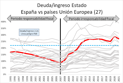 España finaliza el siglo XX e inicia el XXI con niveles de deuda en caída libre, mostrando una responsabilidad envidiable en el manejo de las cuentas públicas (como argumentamos en anteriores artículos, la burbuja inmobiliaria no se deja sentir en las cuentas públicas hasta el año 2003, para ese entonces, la responsabilidad fiscal llevaba años haciéndose sentir).