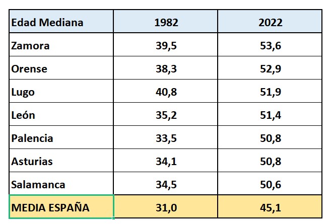 Hablamos de las siete provincias más envejecidas. Curiosamente, las siete son fronterizas entre sí (no todas con todas, claro; pero sí están unas junto a otras). Hablamos de Asturias, Lugo, Orense, León, Zamora, Salamanca, Palencia. Son las únicas siete provincias españolas con una edad mediana superior a los 50 años (pronto se les unirán Ávila, Soria y La Coruña). Es una frontera de esas que llaman "psicológicas" que nos ha llevado a preguntarnos qué está pasando en el noroeste peninsular. Por qué en esta zona los datos de nacimientos y de envejecimiento son tan malos.