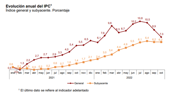 En relación con la inflación, difícilmente se puede considerar un buen dato el 7,3% que hemos registrado en octubre. I) Triplica el valor de referencia del BCE (2%); ii) Continúa dejando a España por encima de la media de la Unión Europea en si tenemos en cuenta la media de los últimos 12 meses; y iii) Los productos básicos, previsiblemente, seguirán creciendo a doble dígito.