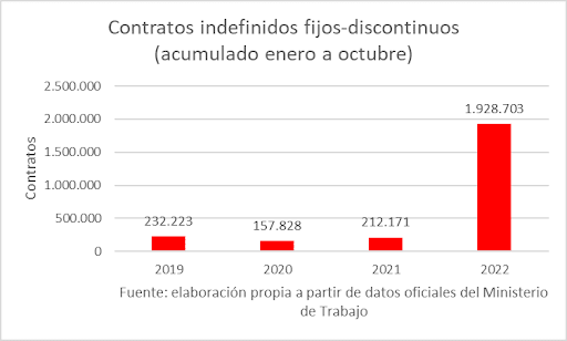 Al analizar el acumulado del año, entre enero y octubre se han creado 1.928.703 contratos indefinidos fijos-discontinuos, que supone un incremento de 1.716.532 contratos sobre el mismo período del año anterior. Por tanto, hay un artificio de más de un millón y medio de este tipo de contratos acumulado en el año.