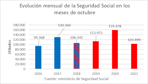 En cuanto a la afiliación a la Seguridad Social, sube en 103.499 personas, pero es el peor dato de afiliación en octubre de los últimos cinco años.
