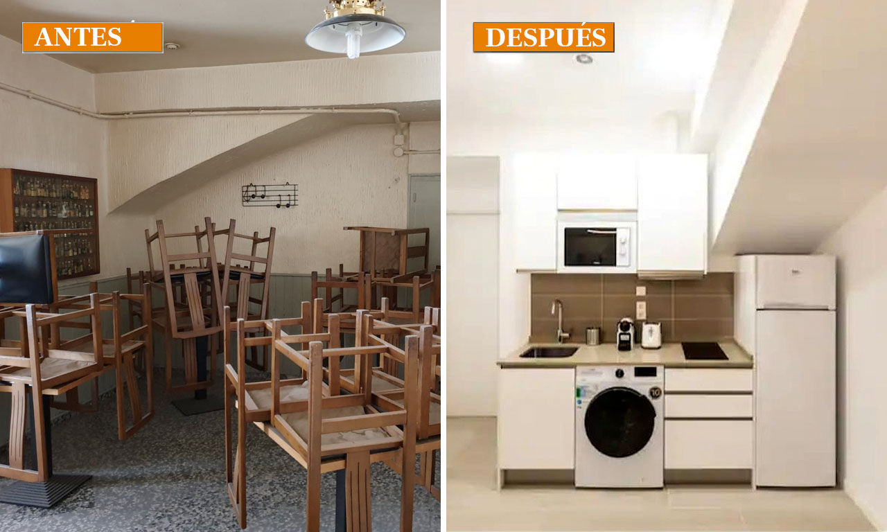 En la siguiente imagen se observa la transformación que ha hecho Goitia del comedor de un restaurante en una vivienda turística (sacó dos de ellas en ese espacio). "Si las habitaciones de hotel no tienen límites de metros cuadrados, como es lógico, ¿por qué los tienen que tener las viviendas turísticas?" se pregunta.