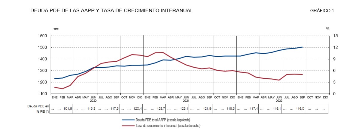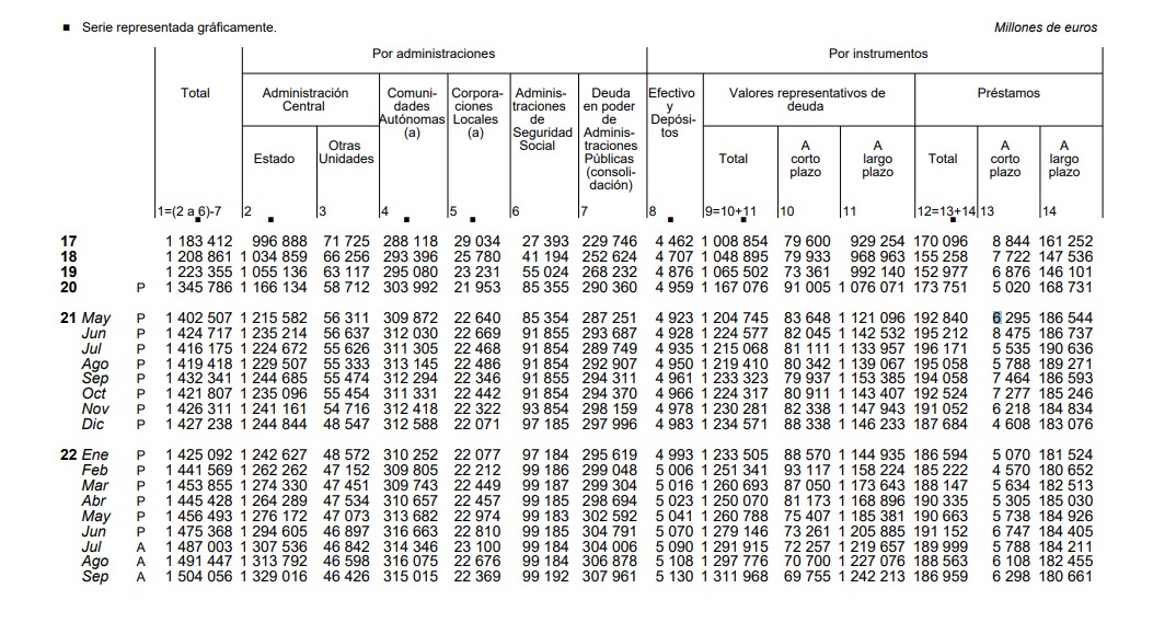 La deuda pública se desboca en España. El endeudamiento del conjunto de las administraciones públicas subió en septiembre hasta la cota máxima de los 1,504 billones de euros, una cuantía nunca vista en la historia de nuestro país.