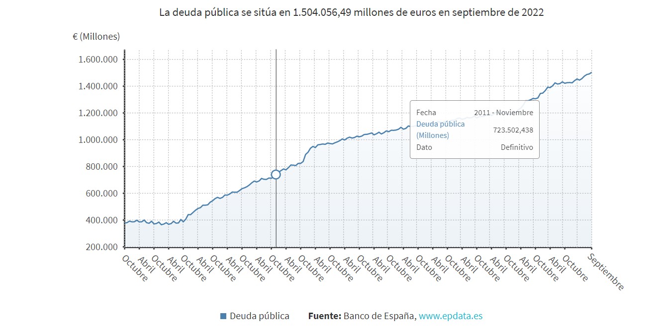 Cabe destacar también la contribución del Gobierno de Mariano Rajoy a avivar esta insostenible situación porque, si en noviembre de 2011 las erráticas políticas de Zapatero dispararon la deuda hasta los 723.000 millones de euros, esa cuantía, aunque elevada, era la mitad que la actual.