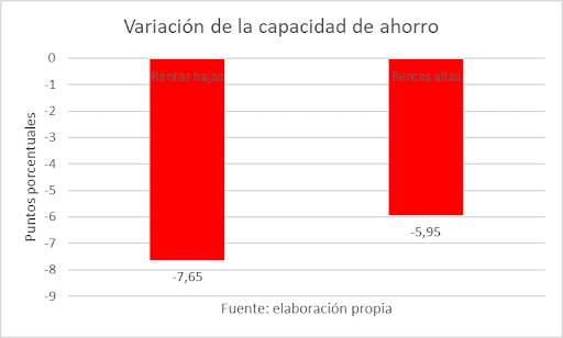 Las rentas bajas reducen su capacidad de ahorro en casi dos puntos más que las rentas altas: las rentas bajas consumen 7,65 puntos más que antes, frente a los 5,95 puntos que las rentas altas consumen más que antes: 7,65-5,95= 1,70 puntos.
