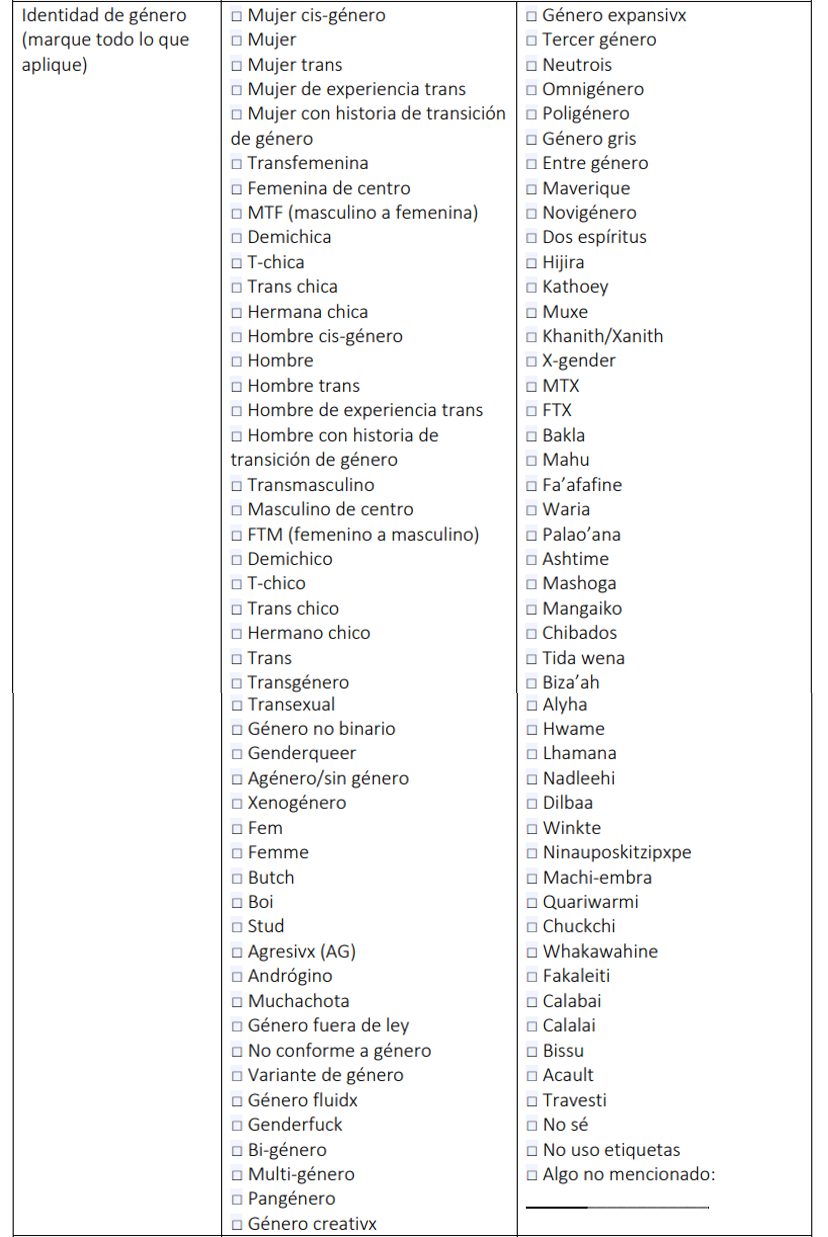 Pero lo que más sorprende es que los solicitantes deben elegir todas las "identidades de género" con las que se sientan identificados. Y son más de 100. Por ejemplo, pueden identificarse como demichica, hermana chica, transmasculino, kathoey, x-gender, poligénero, omnigénero, tercer género, género expansivx, genderfuck, pangénero, travesti, dos espíritus, agresivx o muchachota, entre muchos otros. Y, al mismo tiempo, pueden elegir todas las orientaciones sexuales que apliquen: asexual, maricón, lesbiana, bdsm, aromántico, poliamoroso, tortillera, skoliosexual, demisexual, etc.