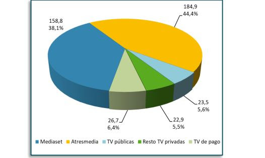 Si nos fijamos en los ingresos publicitarios, los dos principales grupos de televisión, Mediaset y Atresmedia, representaron conjuntamente el 82,5% de los ingresos de publicidad en televisión. Este porcentaje fue del 88,1% si solo se tiene en cuenta el segmento de televisión en abierto.