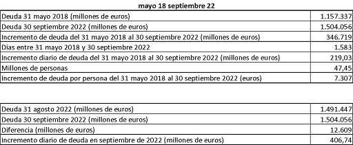 La deuda supera los 1,5 billones de euros, que supone el 115,49% del PIB español sobre la estimación de crecimiento de PIB nominal del Gobierno a partir del dato de previsto para 2022 en el plan presupuestario (1,302 billones de euros), así como su previsión de déficit en 2022 que aparece en dicho plan (5%), pese a la recaudación extraordinaria que están teniendo derivada de la inflación, que significa que el gasto se está acelerando.