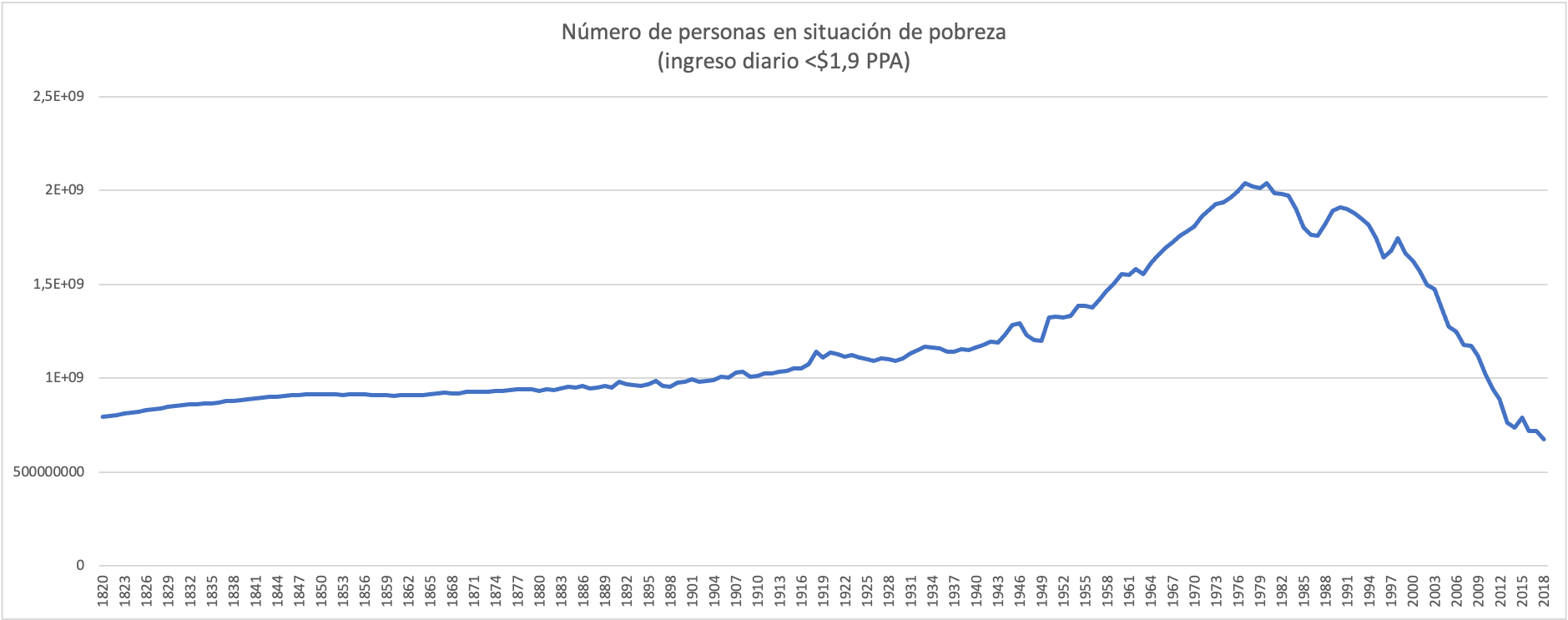 ¿Qué nos dicen los datos? De acuerdo con los datos que ha publicado la OCDE, la pobreza global (ingreso diario inferior a 1,9 dólares diarios, medidos en paridad de poder adquisitivo) superó el umbral de los 800 millones durante buena parte de los cien últimos años. Sin embargo, en los últimos años se ha producido una mejora sostenida que ha permitido reducir el número de pobres hasta los 674 millones de personas.
