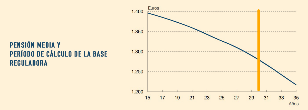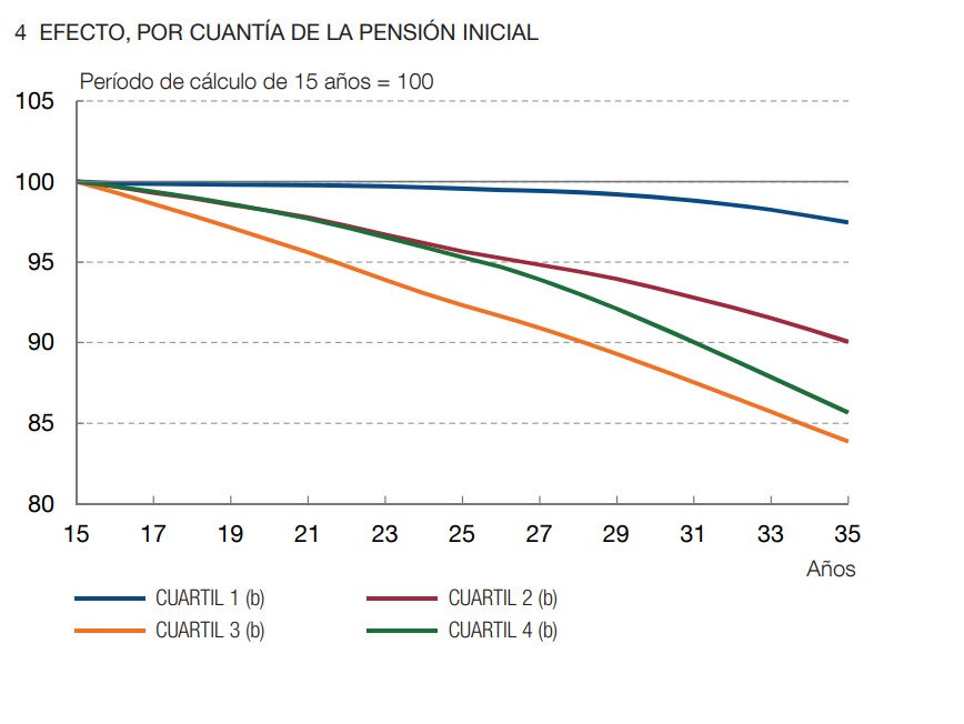 Según los autores del informe, "el efecto marginal de ampliar un año el período de cálculo sería creciente en el número de años computados. Por ejemplo, entre 15 y 25 años, un año adicional del período de cálculo disminuiría en media la pensión inicial un 0,5%, mientras que, entre 25 y 35 años, dicha reducción media aumentaría hasta un 0,9%". Por lo tanto, pasar de 25 a 30 años supondría una estocada del 4,5% a esos futuros pensionistas. Como se observa en el gráfico, según van ampliándose los años de cálculo, va disminuyendo sistemáticamente la pensión.