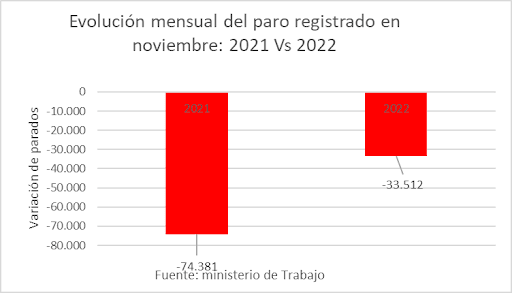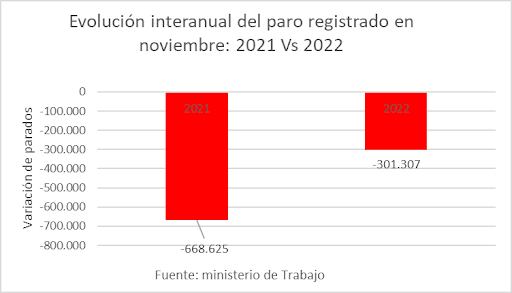 Del mismo modo, el descenso de paro interanual también es la mitad que en noviembre de 2021.