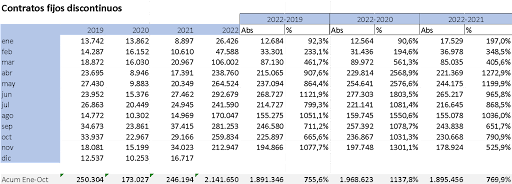 El incremento de 178.924 contratos indefinidos fijos discontinuos en tasa interanual supone una subida del 525,89%, que da una idea del artificio que supone la conversión de contratos temporales en fijos-discontinuos, no respondiendo a la evolución de la actividad económica real.