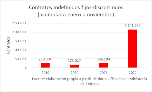 Es más, al analizar el acumulado del año, entre enero y noviembre se han creado 2.141.650 contratos indefinidos fijos-discontinuos, que supone un incremento de 1.895.456 contratos sobre el mismo período del año anterior.