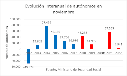 En términos interanuales, es el peor mes de noviembre para los autónomos desde 2012 (con excepción de 2020, con todas las restricciones operativas por la pandemia).