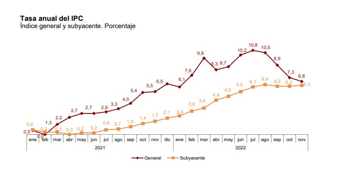 Así aplaudía el presidente del Gobierno, Pedro Sánchez, el dato de inflación que publicó ayer miércoles el Instituto Nacional de Estadística (INE). El pasado mes de noviembre, el Índice de Precios de Consumo (IPC) bajó una décima respecto a octubre y moderó su tasa interanual, hasta el 6,8%. ¿Es un resultado para celebrar?