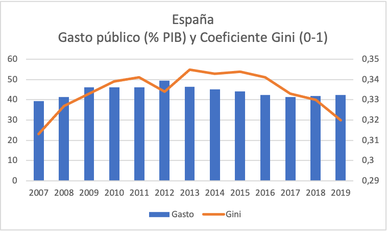 En la misma línea, podemos analizar los datos de la propia España a lo largo del tiempo. Así, entre 2007 y 2012 el gasto subió del 39,3% al 49,5% del PIB, pero el Coeficiente Gini no solo no se redujo, sino que fue del 0,31 al 0,33. En cambio, entre 2013 y 2018 el peso del Estado se redujo hasta el 41,8% del PIB pero la desigualdad se redujo ()pasó a ser del 0,32.