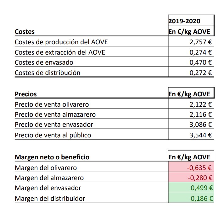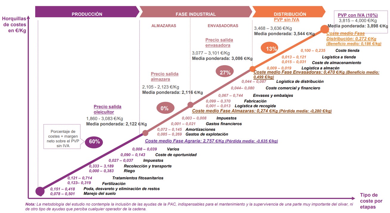 - De los costes (sin IVA) del kilo de aceite, la distribución (los malvados supermercados) sólo es responsable del 13%