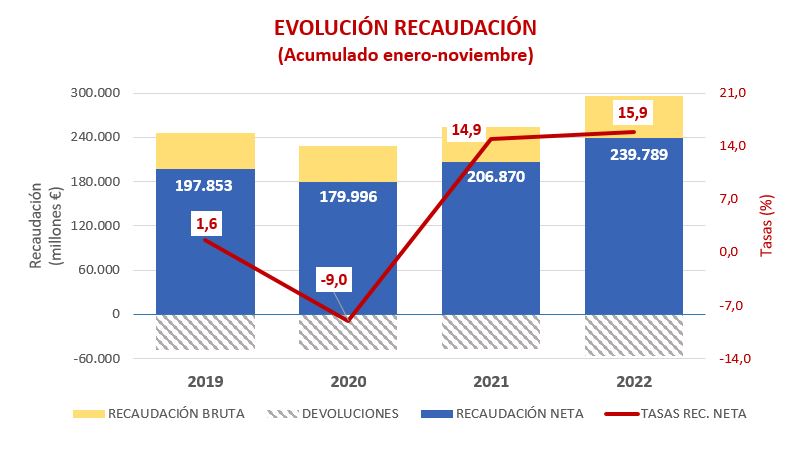 La recaudación tributaria acumulada de enero a noviembre acumula un crecimiento interanual del 15,9%. Si analizamos los datos en términos brutos, la subida es del 16,7%, si bien las devoluciones realizadas en los once primeros meses del año dejan la cifra neta ocho décimas por debajo de dicho porcentaje. Por otro lado, un análisis homogéneo de los datos eleva al 16,8% el aumento de los caudales públicos.