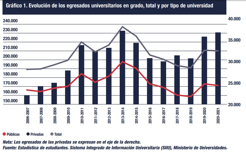 Según los datos que ofrece este estudio, el número de egresados universitarios en grado dentro del sector público ha pasado de representar el 84,7% del total en el curso 2016-2017 a un 82,1% en el curso 2020-2021. Pero, además, en el gráfico que presenta la fundación podemos ver cómo en los últimos tres años la universidad pública se estanca mientras la privada crece.