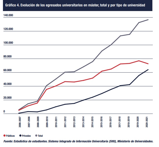 En el gráfico ofrecido por la fundación vemos como el número de alumnos de másteres públicos retrocede en el último curso mientras que, en los últimos años, la cantidad de egresados en el sector privado se dispara. "Durante el curso 2019-2020 el número de egresados de másteres oficiales españoles se incrementó prácticamente un 15% en comparación con el dato del curso anterior. En 2020-2021 ha continuado la tendencia creciente, si bien con un crecimiento más moderado, en este caso del 3,2%, lo que supone un total de 135.419 egresados. Por titularidad del centro, al igual que en el grado, los egresados de máster oficial de las universidades públicas disminuyeron respecto al curso precedente, mientras que los de las privadas tuvieron un fuerte ascenso (variaciones respectivas del -5,7% y 15,4%)".