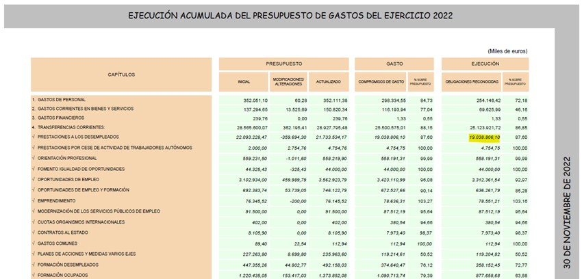 ¿Seguro? Alguien debería preguntar a las Vicepresidentas Díaz o Calviño, o incluso al Presidente del Gobierno, la razón por la cual la partida destinada a pagar "Prestaciones a los Desempleados" que registra el Servicio de Empleo Público Estatal se ha incrementado en 2.000 millones de euros en los últimos 3 años. Concretamente, hasta noviembre de 2022, el desembolso en prestaciones por desempleo asciende a 19.000 millones de euros, mientras que en 2019 era de 17.100 millones, según los datos de ejecución presupuestaria que da el propio SEPE.
