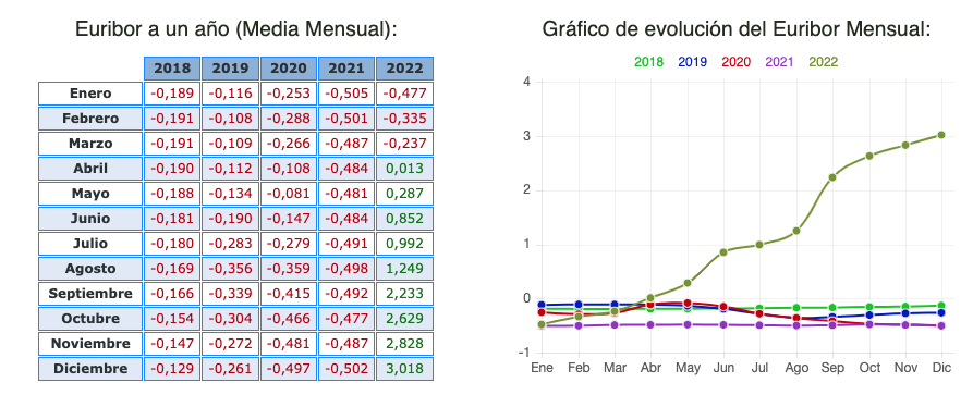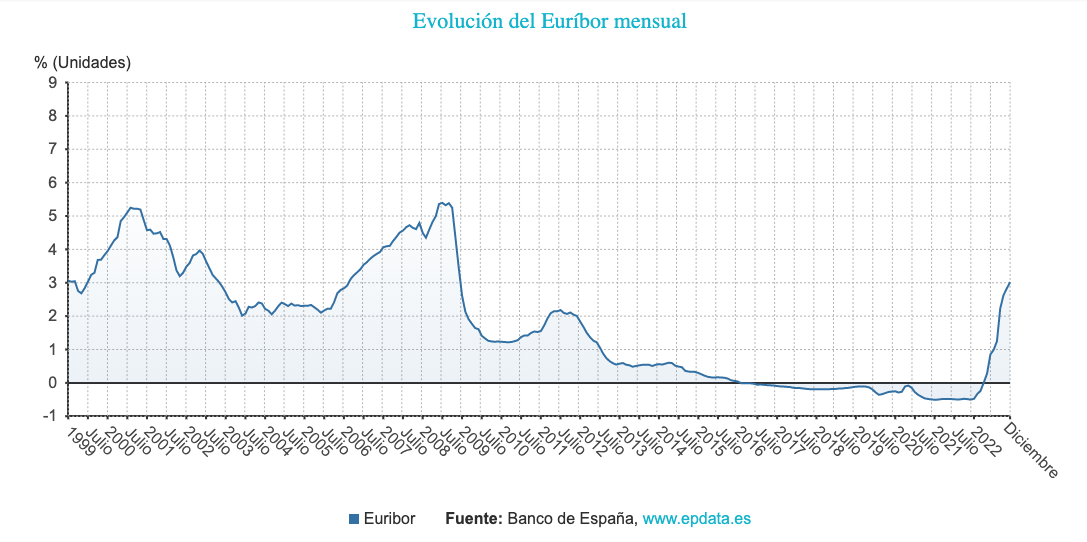 Con un euríbor por encima del 3% (actualmente en el 3,3%) y con un diferencial en su hipoteca del 1%, pasará de pagar un interés del 0,5% cuando todavía estaba en negativo al 4,3% a partir de la revisión que se produzca, por ejemplo, ahora en el mes de enero.