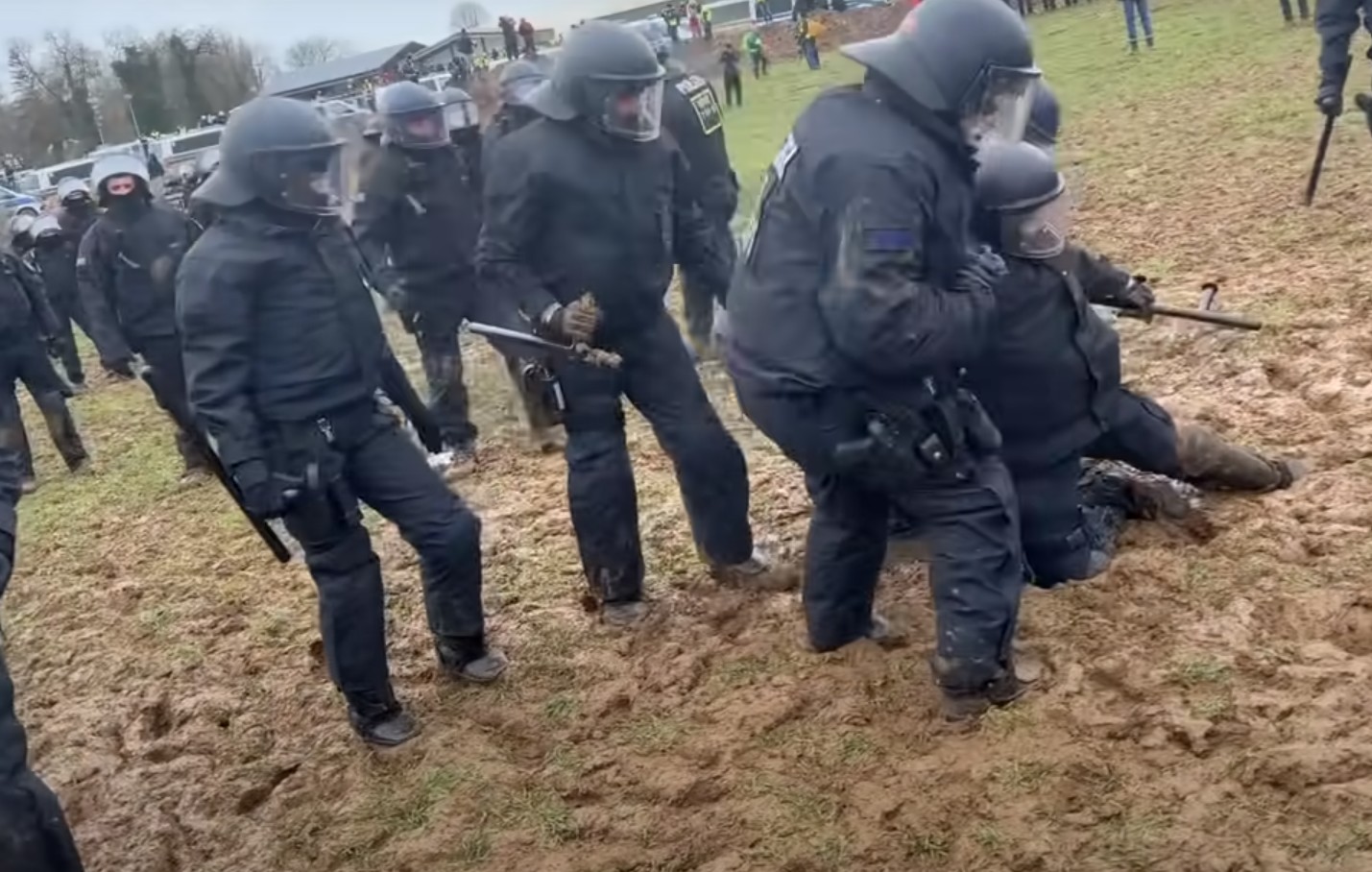 Los agentes utilizaron cañones de agua y gas pimienta contra los ecologistas, que a su vez recibieron a la Policía con pirotecnia, piedras y cócteles molotov. Entre los numerosos vídeos de los policías enfrentándose con los activistas, difundidos por asociaciones como Alle Dörfer bleibt, destaca uno en el que se observa cómo algunos de los agentes quedan atrapados por el barro. En la esperpéntica escena, los policías atrapados luchan por salir entre burlas de los asistentes.