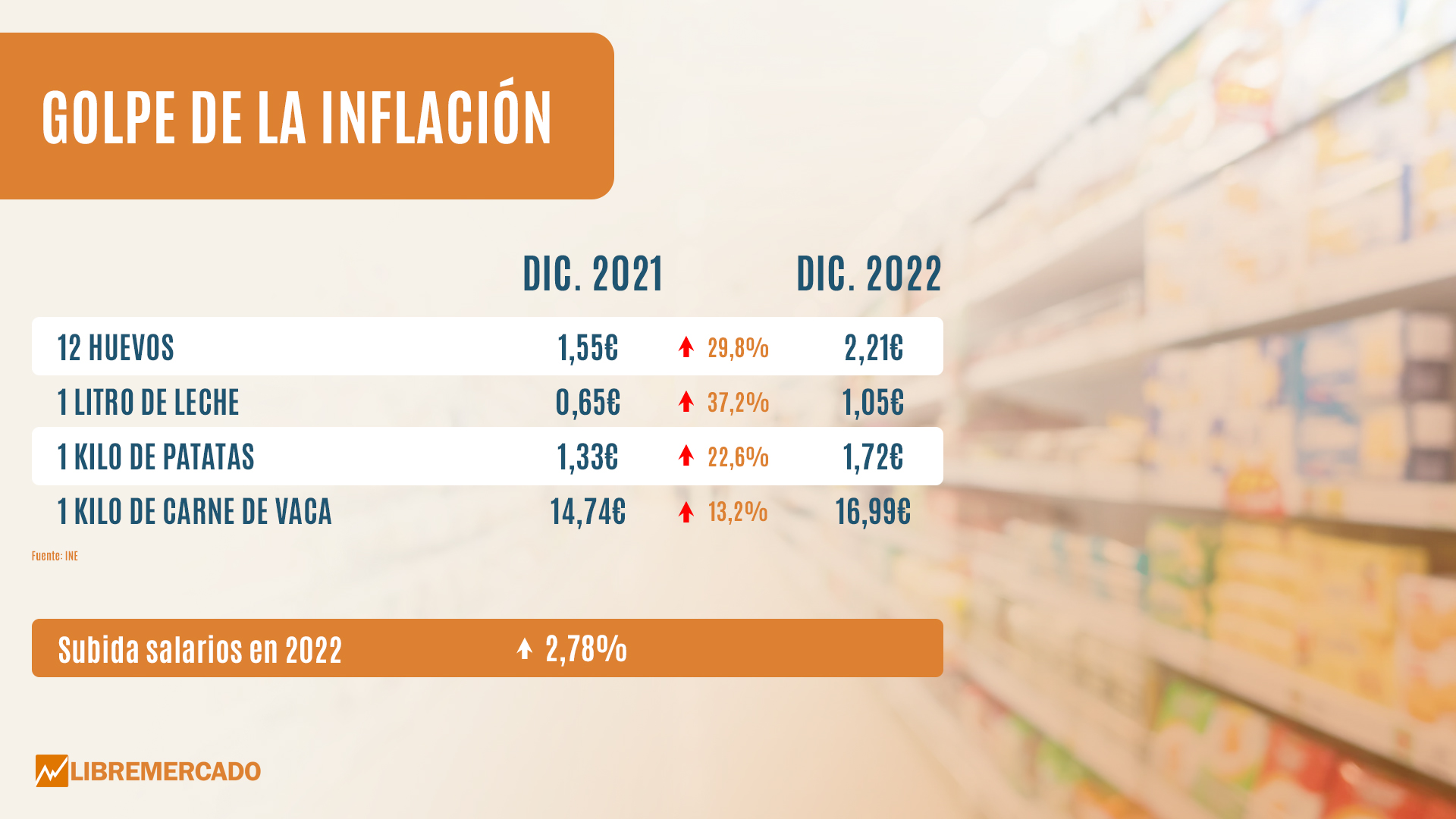 Si hace un año una docena de huevos costaba un euro y medio, el mismo producto alcanza ahora los 2,21 euros, lo que supone un encarecimiento de más del 30%. Con la leche ocurre lo mismo: el cartón ha pasado de costar 65 céntimos a más de un euro en 12 meses, casi un 40% más. Y si tenemos en cuenta que la subida de los salarios en España ha sido del 2,78%, la perdida de poder adquisitivo de los consumidores es desorbitada.