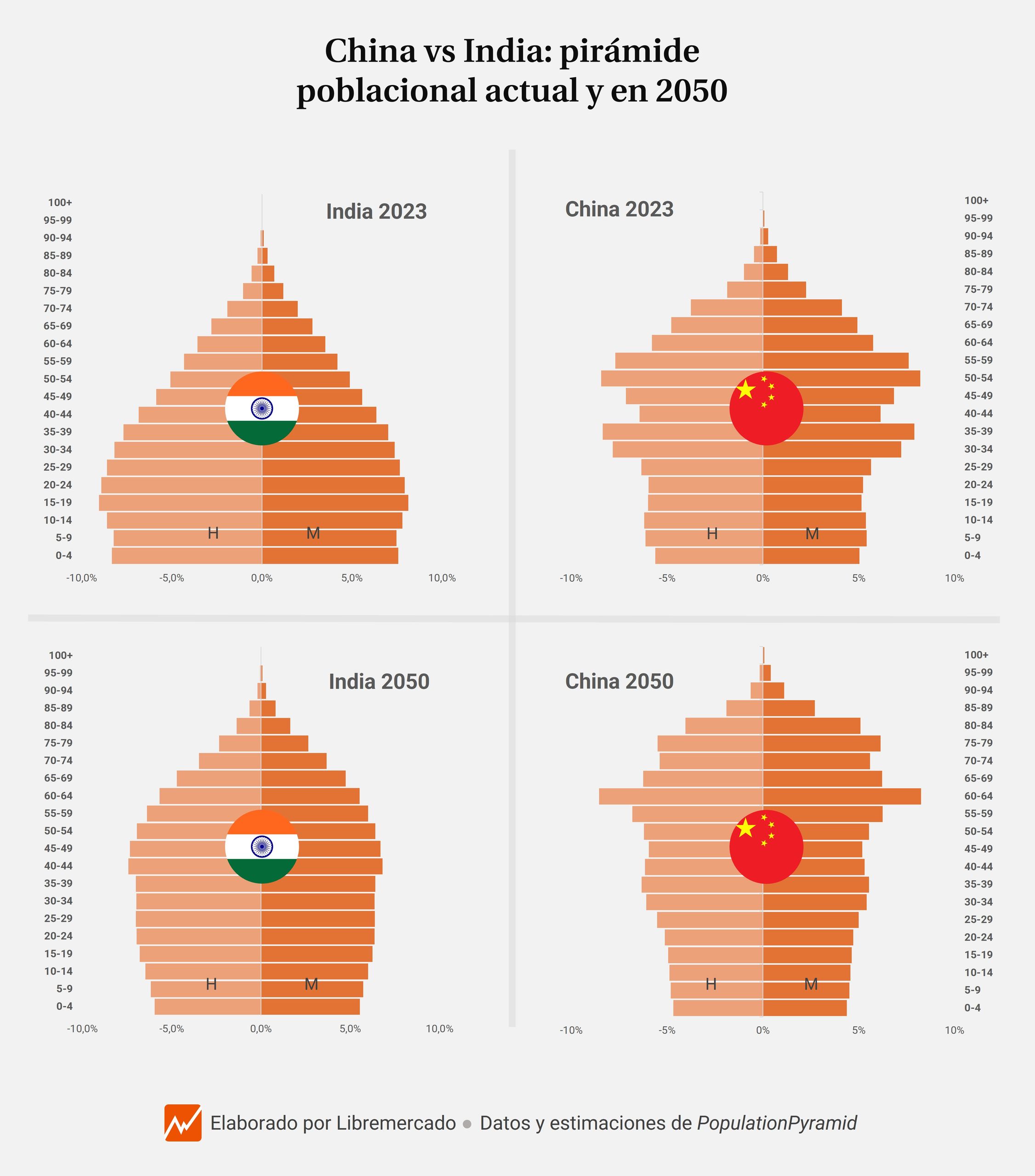 Si observamos la estructura demográfica a través de pirámides de población, podemos comprobar que India cuenta en estos momentos con una base muy destacable de ciudadanos jóvenes e infantes. Con el paso de los años, toda esa masa de población conformará un abultado grupo de mediana edad, sin que ello comporte una reducción drástica de la natalidad. Y eso es mucha gente trabajando, emprendiendo, innovando y haciendo despegar al país.