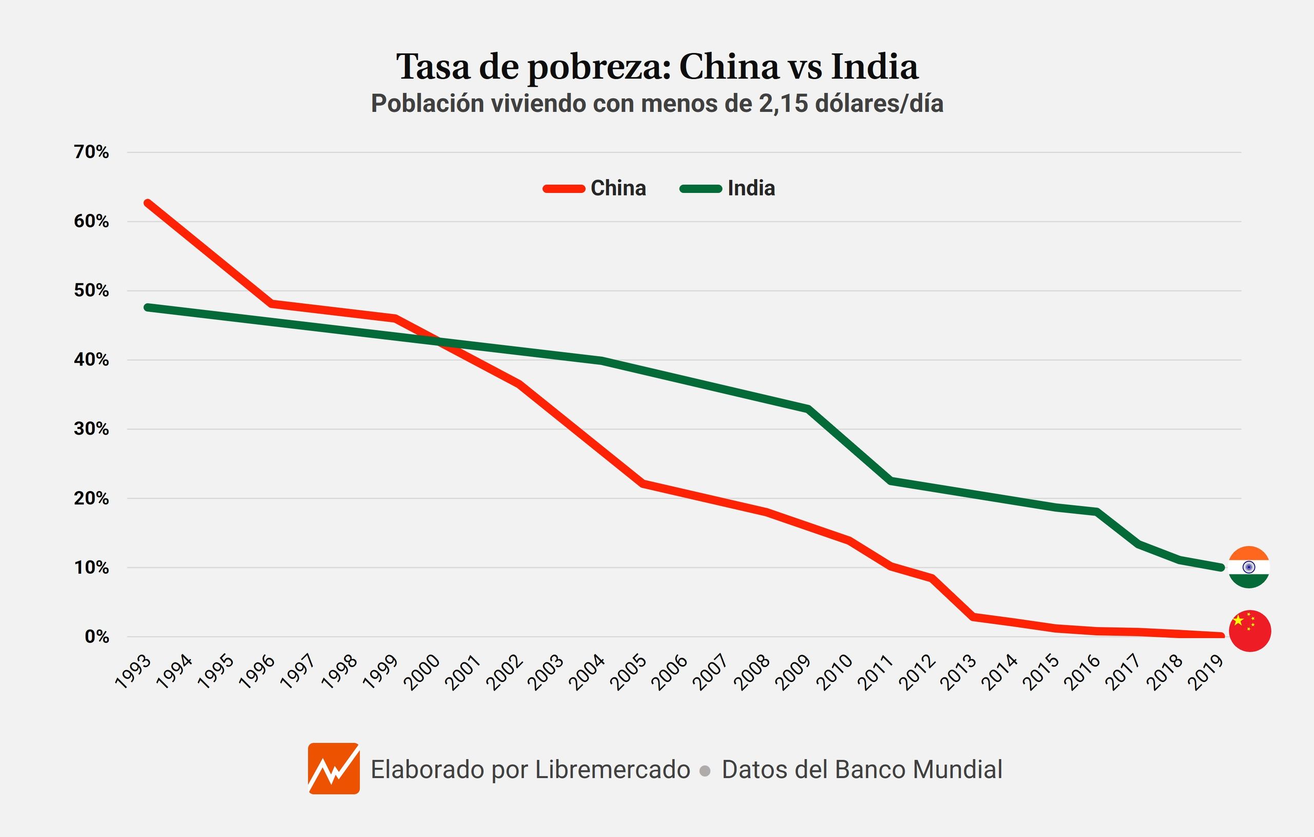 Aun con todo, uno de los retos que deberá afrontar la India es el de reducir los niveles de pobreza y constituir una sólida clase media. Los últimos datos del Banco Mundial (2019) confirman que hay más de 129 millones de indios viviendo en pobreza extrema, el dato más elevado del planeta. Aún así, el desempeño del país sudasiático en esta materia ha sido francamente positivo en las últimas décadas. Mientras que en los años noventa casi la mitad de los indios vivían con menos de 2,15 dólares al día, en la actualidad esa cifra se sitúa en el 10%, y continuará reduciéndose en los próximos años.