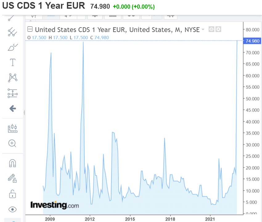 Mientras tanto, en Estados Unidos se ha producido un fenómeno cuanto menos curioso: Ante la amenaza de que el Gobierno Federal llegue al límite de gasto (algo que ya llevamos viendo muy frecuentemente en los últimos años y que se salda con un acuerdo para incrementar dicho límite) los seguros de impago de crédito (CDS) a 1 año se han disparado hasta niveles históricamente altos.
