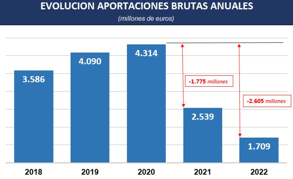 Comparativamente, esto supone que los ahorradores aportaron el año pasado un 32% menos de dinero a planes de pensiones que durante el 2021, cuando se sumaron 2.529 millones brutos. Desde el año 2020 – cuando se superaron los 4.314 millones de aportaciones – hasta ahora, la caída se sitúa en torno al 60%.