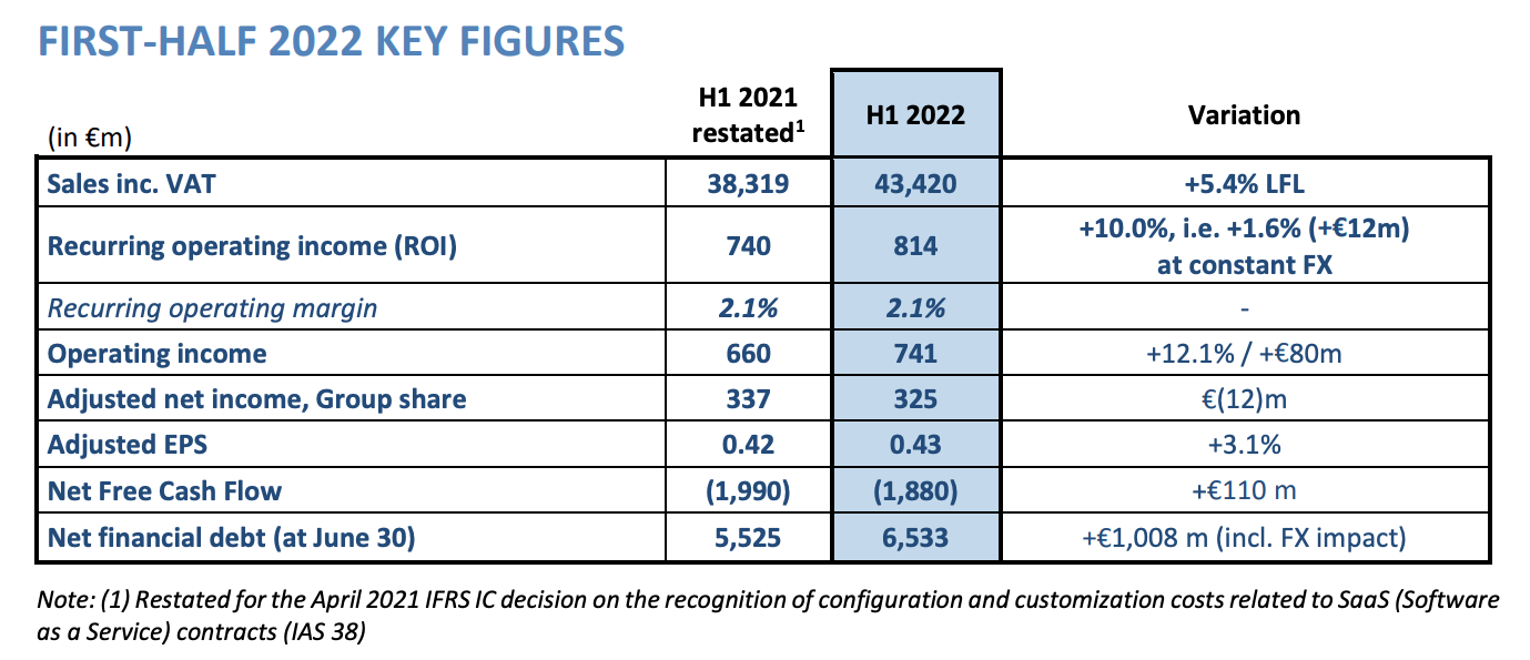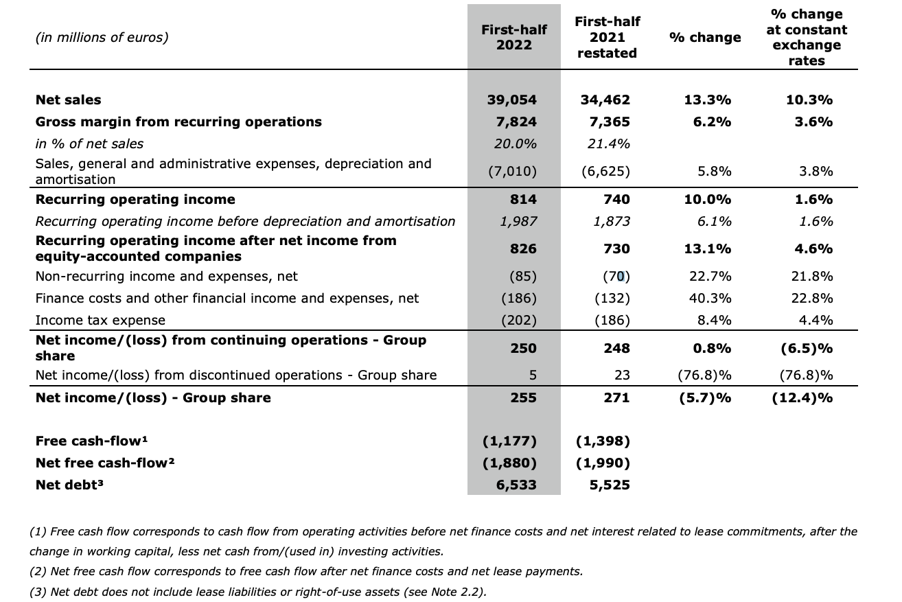 Así, si repasamos la cuenta de resultados de Carrefour y de la mayoría de las empresas del ramo, nos encontramos con la cruda realidad de que las abultadas cifras de facturación de la cadena gala contrastan con unos beneficios muy estrechos. Así, la información financiera suministrada por Carrefour para el primer semestre de 2022 pone de manifiesto que las ventas totales de la compañía ascendieron a 43.420 millones, pese a lo cual el margen operativo fue de apenas un 2,1%, alcanzando un retorno de 814 millones sobre la inversión realizada.
