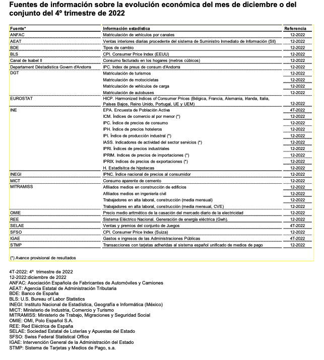 En esta nota, el INE hace referencia a los datos empleados para el avance del PIB de 2022, referente al cuarto trimestre y cierre de año. En ella, no sólo señala los motivos por los que, dice, los datos no son definitivos, sino que enseña las fuentes de información de las que bebe para completar estos datos: