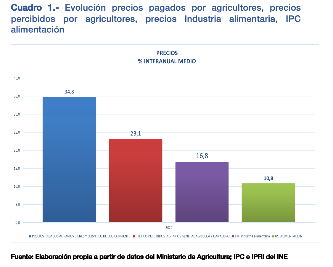 Los datos facilitados por el Ministerio de Agricultura muestran que los precios pagados por el sector primario en la adquisición de bienes y servicios de uso corriente han aumentado un 34,8% durante el último año. La fortísima subida de precio está en todas partes: la vemos en los cereales, los fertilizantes, los cartones, el vidrio, los plásticos, los combustibles… Por lo tanto, el problema de costes arranca al comienzo de la cadena de valor.