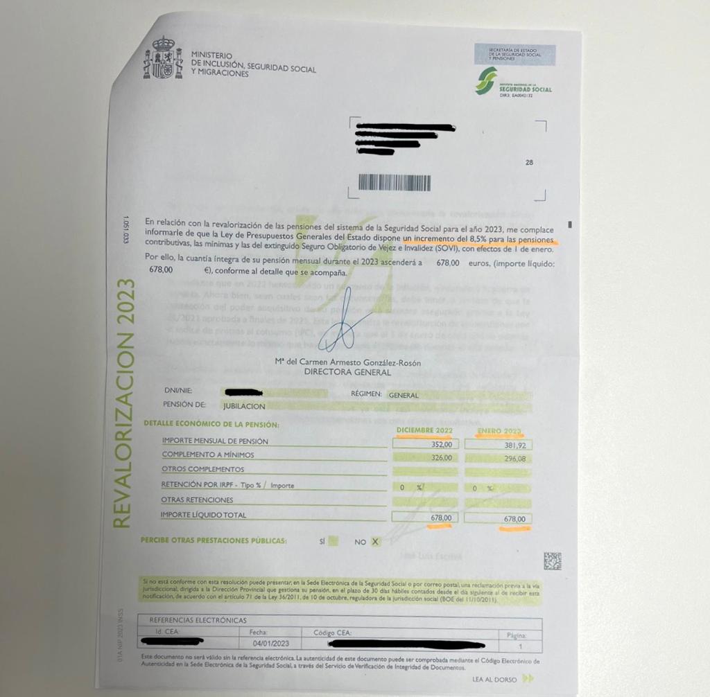 Muchos pensionistas, en concreto, los de menores prestaciones por jubilación, están recibiendo en sus casas la constatación de un verdadero timo: Pedro Sánchez anunció que actualizaría las pensiones con el dato de inflación medio de un 8,5%. Pero olvidó explicar que a los pensionistas con menores ingresos, aquellos que tienen que recurrir a una partida social denominada "complemento de mínimos", se les iba a compensar lo subida con la bajada en esa parte social. Resultado: como se puede ver en el documento que hoy aporta Libertad Digital, un pensionista que cobraba 678 euros en diciembre de 2022 ha pasado a cobrar un total de 678 euros en enero de 2023, fruto de una generosa subida de cero euros. Y en esa situación de cobro de la partida social de complemento de mínimos hay nada menos que 2,17 millones de pensiones en España.