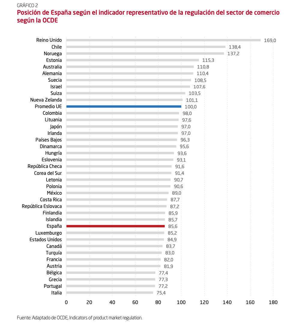 La regulación aplicada al sector comercial "es peor que la de nuestro entorno, ocupando la posición 27 de 38 países dentro del ranking de la OCDE. En promedio, estamos un 15% por debajo del promedio observado en la Unión Europea. Lo peor de todo, además, es que la tendencia observada en los últimos años arroja un claro deterioro".