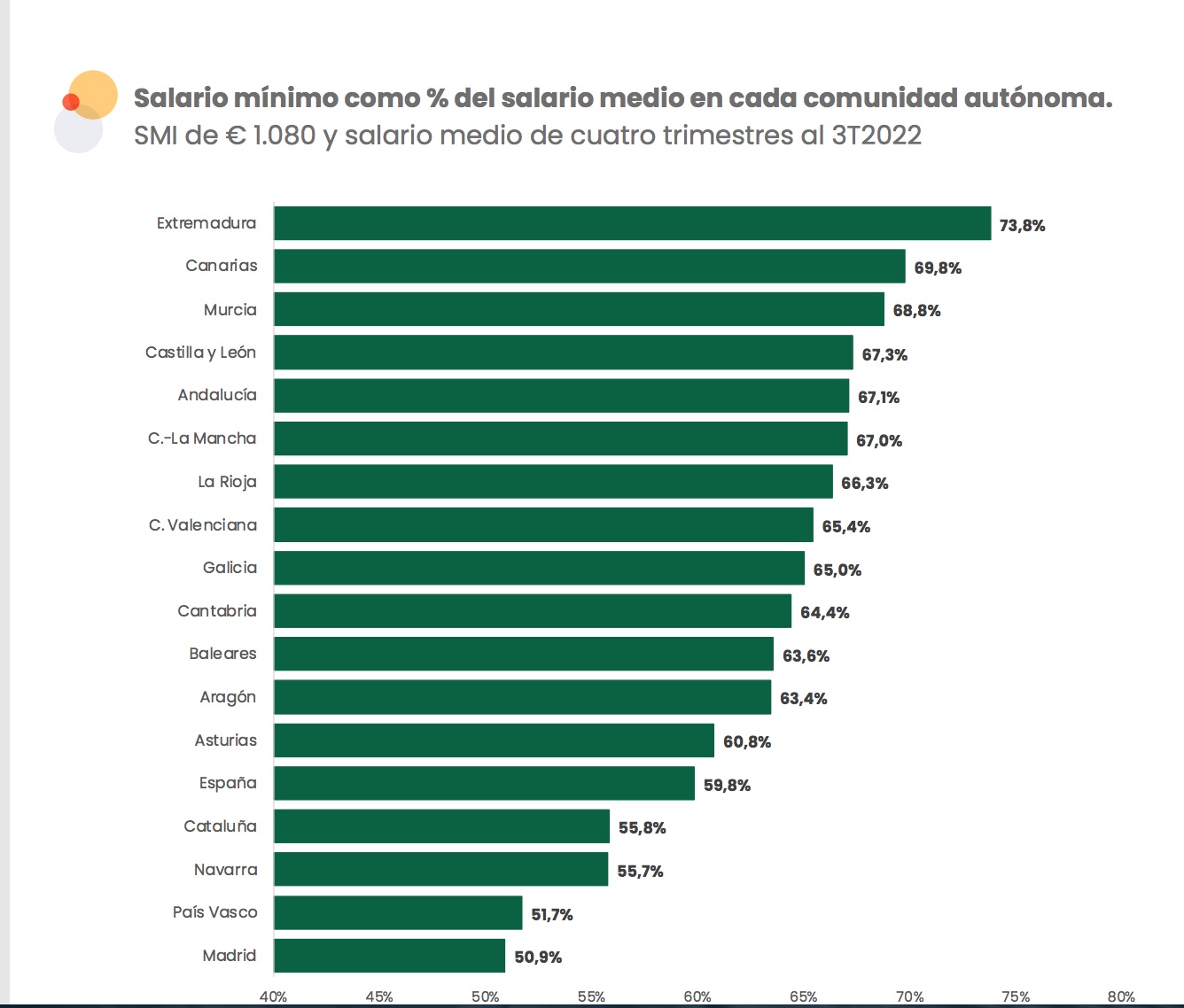 El documento avisa de que elevar el salario mínimo a 1.080 euros lleva a que el SMI supere el 60% del salario promedio en 13 comunidades autónomas. La Comunidad de Madrid, País Vasco, Navarra y Cataluña son las únicas regiones en donde el salario mínimo se mantiene por debajo del 60% (aunque superior del 50%) de la remuneración promedio, por lo que son las que menos problemas tendrían porque son las que más pagan.