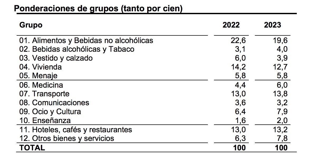 Uno de los principales cambios es la revisión anual de la estructura de ponderaciones que forman el IPC. Cada año, el INE ejecuta cambios en el peso que otorga a los 12 grupos principales que forman la inflación, aunque sorprende que esta vez haya quitado relevancia al precio de los alimentos, que es el componente más importante del IPC (el que más pesa) y cuyo precio se ha disparado en el último año un histórico 15,7% (según vemos en el dato de diciembre).