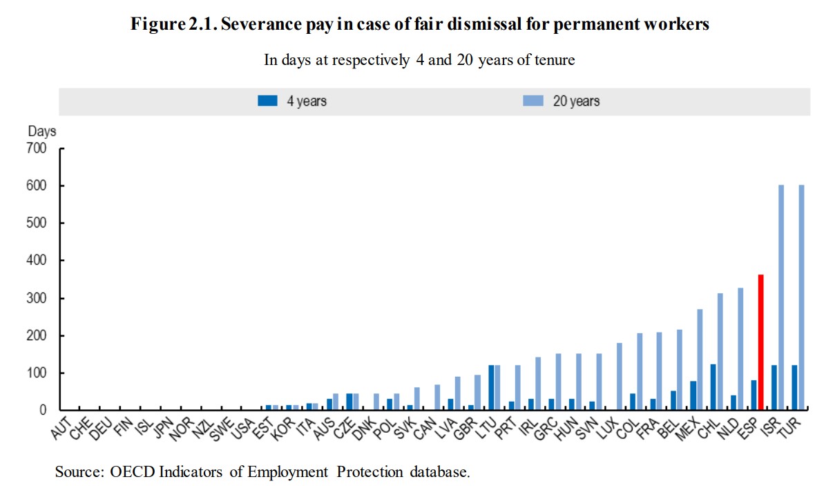 Así, la OCDE establece cuatro criterios de flexibilidad: Requisitos procedimentales; Tiempo de preaviso e indemnización; Normativa sobre despidos improcedentes; Aplicación de esta normativa. Luego, los autores otorgan una puntuación a cada apartado y le dan un color a cada uno de ellos: blanco si la protección legal es baja; azul claro si es media; azul oscuro si es alta. España acaba en la parte medio/alta de la tabla (es decir, normativa más bien proteccionista) junto a Francia o Suecia. Lejos de los mercados más flexibles (EEUU, Canadá, Suiza) y mucho más cerca de Portugal, Chequia o Israel (los más rígidos en el acumulado).