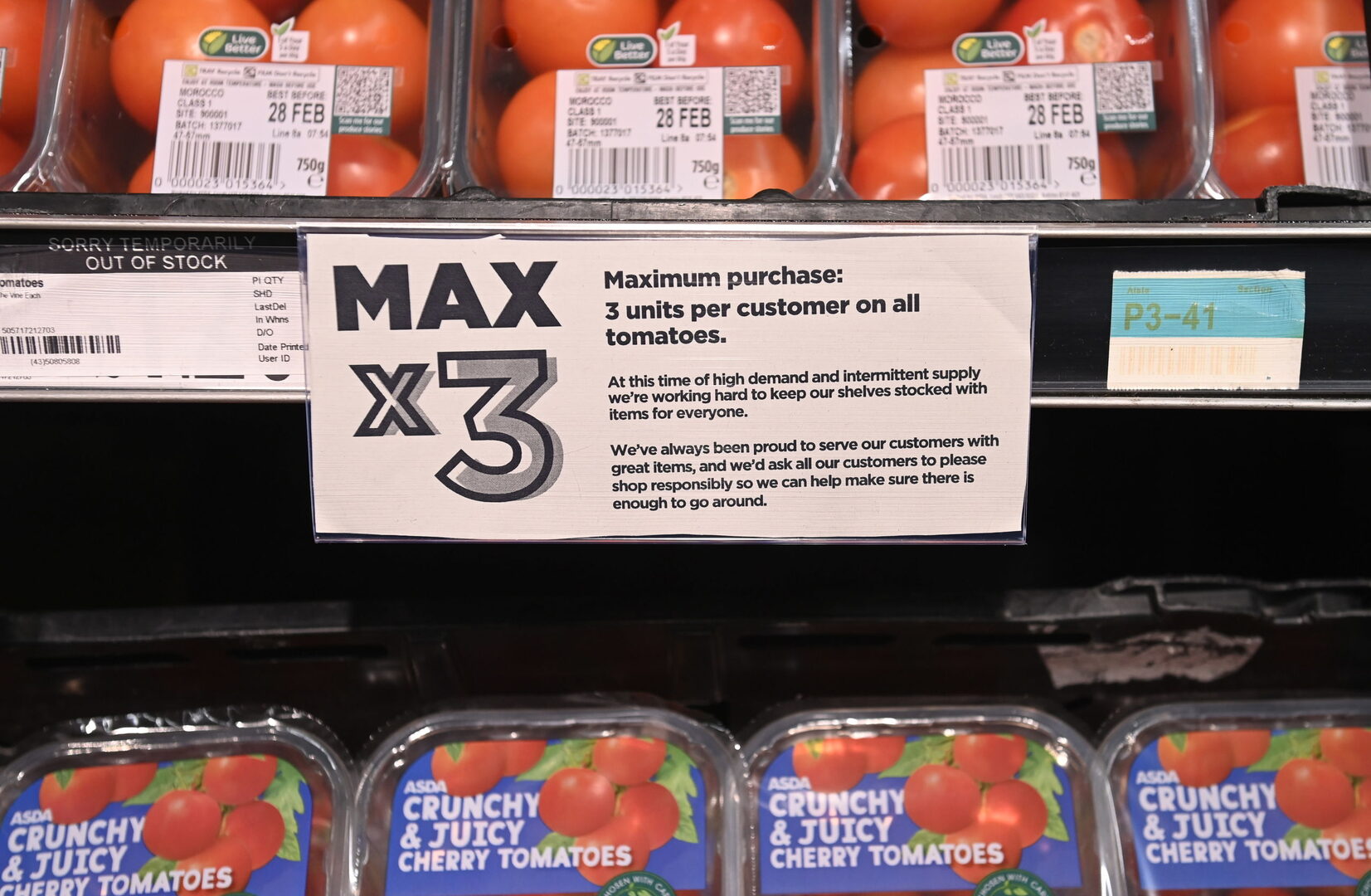 Así las cosas, Morrions ha puesto el límite en dos paquetes de tomates, pepinos, lechugas y pimientos por cada comprador, mientras que Asda permite hasta tres unidades, pero eleva el control a productos como el brócoli, la coliflor o las frambuesas. Algo que, aseguran, podría durar unas semanas más.