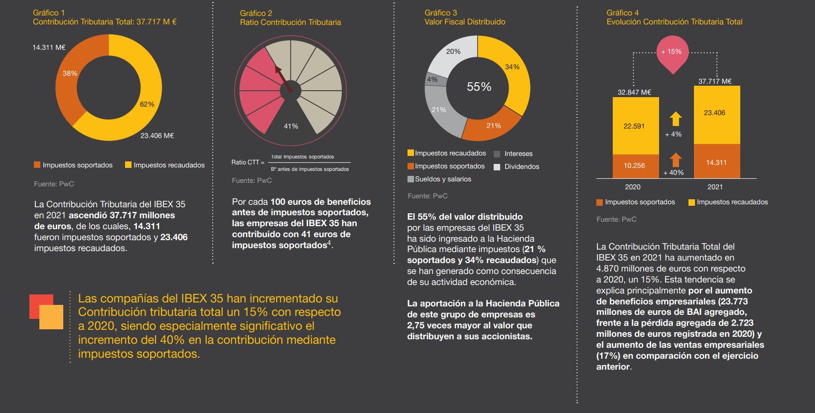 Solo en cuestión de impuestos, se estima que las treinta y cinco mercantiles incluidas en el selectivo bursátil de referencia generaron en 2021 un total de 37.717 millones de euros. De esta cifra, 14.311 millones de euros habrían sido repercutidos directamente sobre estas empresas, mientras que otros 23.406 millones se habrían recaudado sobre diversas bases de su actividad, caso por ejemplo de los sueldos que abonan las corporaciones en cuestión a sus asalariados en España.