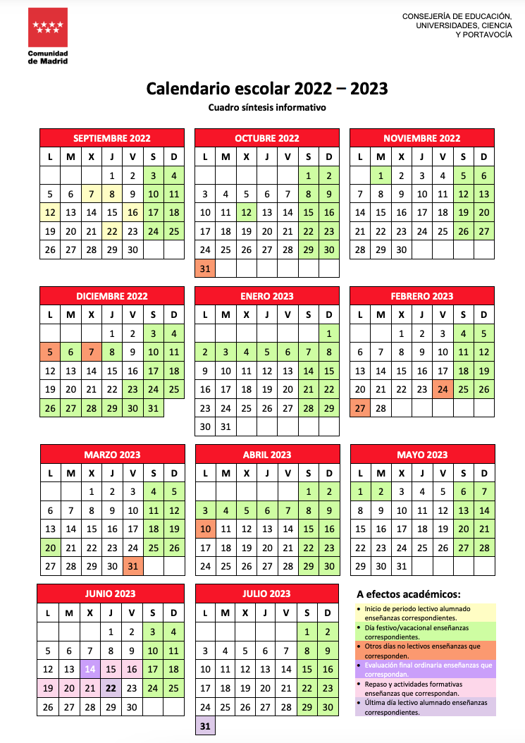 El curso escolar de la Comunidad de Madrid para el ejercicio 2022-2023 abarca desde el 7 de septiembre hasta el 22 de junio. Esto significa que, solamente en los meses de verano, las aulas permanecen cerradas durante dos meses y medio. A este parón hay que sumarle una quincena sin clases coincidiendo con las celebraciones de Navidad, una semana entera de descanso en las fechas de Semana Santa y otros puentes, festivos y días no lectivos que se suceden a lo largo del año.