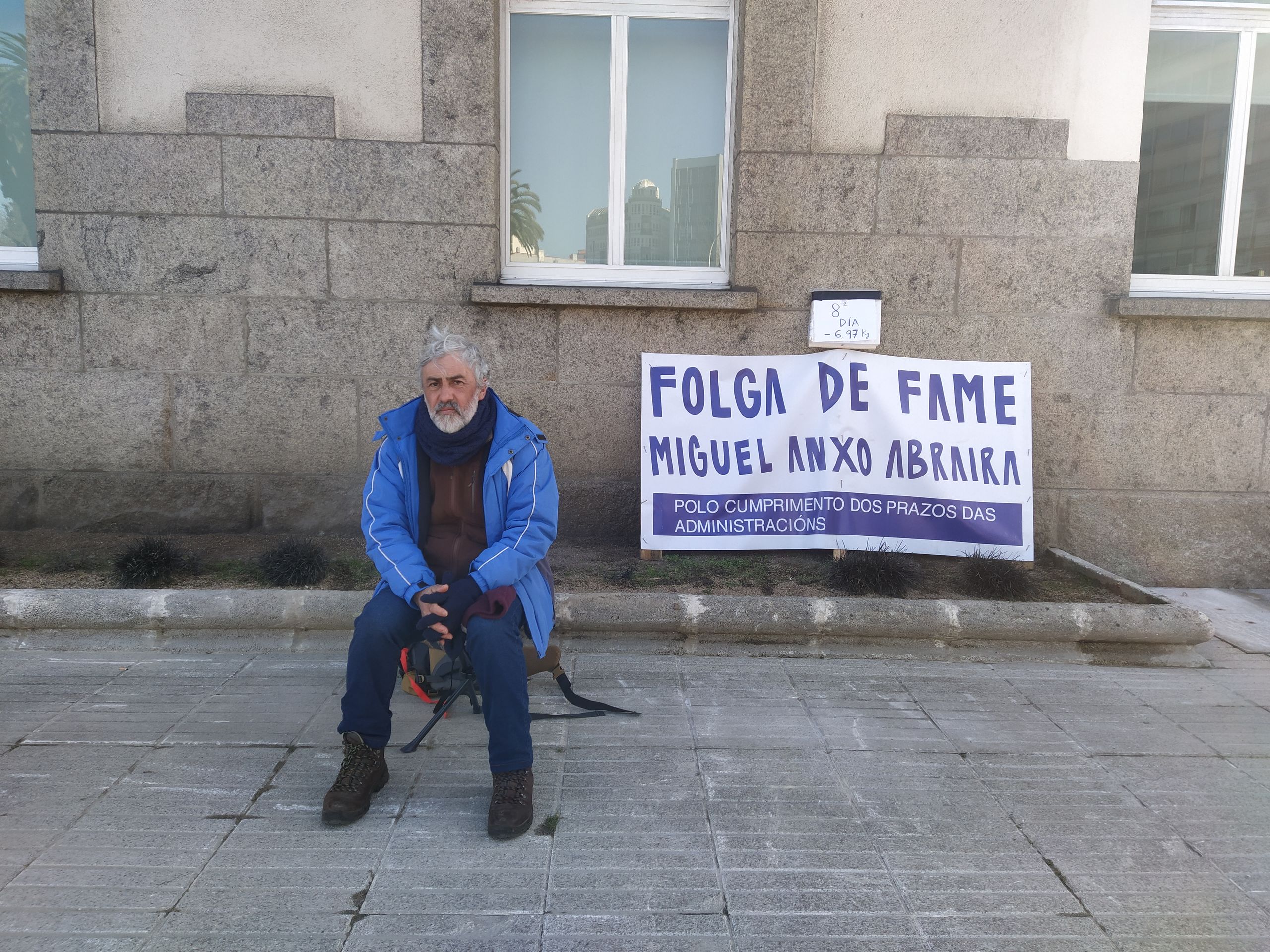 Miguel Anxo Abraira, vecino de un municipio cercano a la capital de provincia llamado Miño, se ha sentado durante 9 días en las escaleras de la entrada del edificio gubernamental manteniendo el ayuno y al lado de un cartel que reza: "Huelga de hambre por el cumplimiento de los plazos de las administraciones".