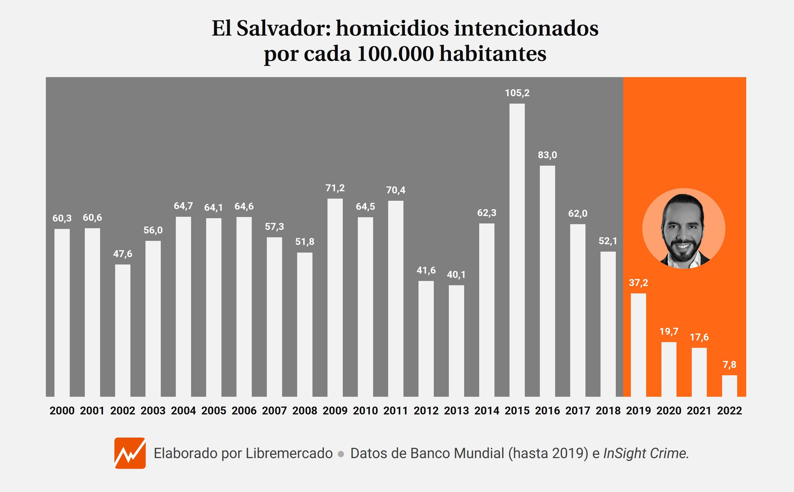 Pero, a día de hoy, la situación ha cambiado de manera muy considerable. El Salvador ya no es el país con más homicidios por habitante, ni está cerca de serlo. Su joven presidente, Nayib Bukele insiste en que el país es ahora, nada más y nada menos, que en el más seguro de su entorno. "Como todos ustedes saben, El Salvador se ha convertido en el país más seguro de América Latina", aseguraba a principios de año, siendo esta una de sus principales proclamas durante el 2023.