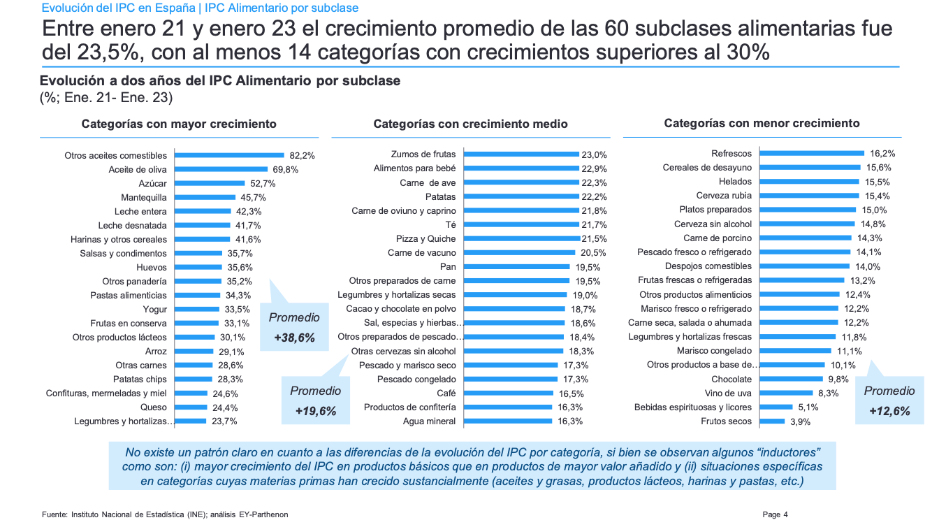 Si se analizan los datos en términos acumulados y se comparan los precios de enero de 2021 con los de enero de 2023, vemos que el crecimiento acumulado en el precio de las sesenta categorías de alimentos analizadas por el EY ascendió, en promedio, al 23,5%. Eso sí: en catorce de las sesenta subclases alimentarias, el encarecimiento observado de 2021 a 2023 habría sido superior al 30%.