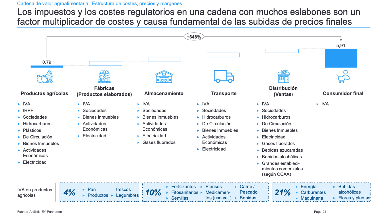 Pero lo más interesante de la ponencia del socio de EY es lo referido a la incidencia de los impuestos y los costes regulatorios en la cadena alimentaria. El siguiente grafismo resume la incidencia de numerosos impuestos en los distintos agentes que intervienen en el proceso: productores agrícolas, fábricas de productos elaborados, empresas de almacenamiento, compañías de transporte, supermercados distribuidores y compras finales por parte de los consumidores. Libre Mercado aborda esta cuestión con más detalle aquí.